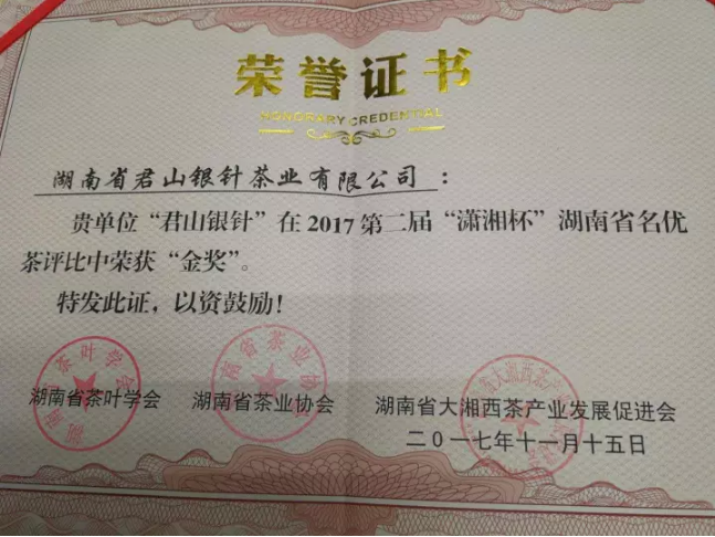 剛剛閉幕的中國茶葉科技年會表彰了第二屆“瀟湘杯”湖南名優(yōu)獎獲獎單位,君山茶業(yè)-君山銀針繼2016年獲得首屆"瀟湘杯"湖南名優(yōu)獎金獎后,再次獲得第二屆“瀟湘杯"湖南名優(yōu)茶金獎。