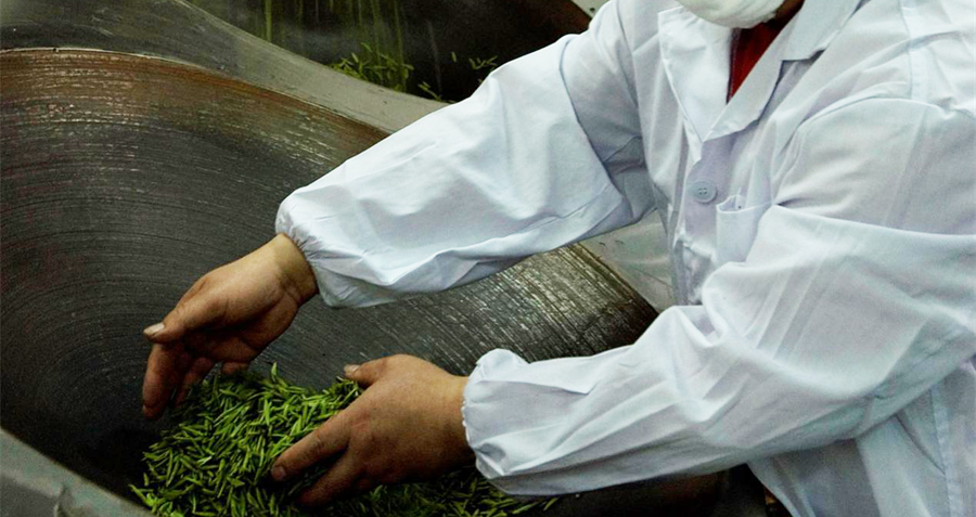 在20°的斜鍋中進行,鍋子在鮮葉殺青前磨光打蠟,火溫掌握“先高(100~120℃)后低(80℃)”,每鍋投葉量300克左右。茶葉下鍋后,兩手輕輕撈起,由懷內向前推去,再上拋抖散,讓茶芽沿鍋下滑。動作要靈活、輕巧,切忌重力摩擦,防止芽頭彎曲、脫毫、茶色深暗。約經4~5分鐘,芽蒂萎軟清氣消失,散發出茶香,減重率達30%左右,即可出鍋。