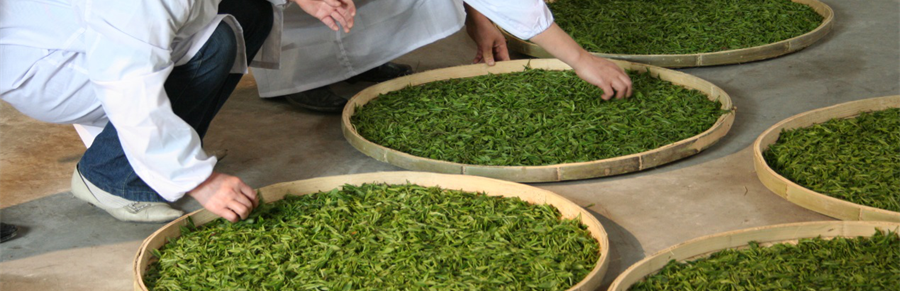 殺青葉出鍋后,盛于小篾盤中,輕輕揚簸數次,散發熱氣,清除細末雜片。攤涼4~5分鐘,即可初烘。