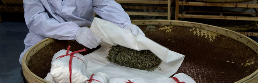 烘葉稍經攤涼,即用牛皮紙包好,每包1.5公斤左右,置于箱內,放置40~48小時,謂之初包悶黃,以促使君山銀針特色香味的形成,為君山銀針制造的重要工序。每包茶葉不可過多或過少,太多劇烈化學變化,芽易發暗,太少色變緩慢,難以達到初包的要求。由于包悶時氧化放熱,包內溫度逐升,24小時后,可能達30℃左右,應及時翻包,以使轉色均勻。初包時間長短,與氣溫密切相關。當氣溫20℃左右,約40小時,氣溫低時應當延長時間,當芽頭現黃色即可松包復烘。通過初包,銀針品質風格基本形成。